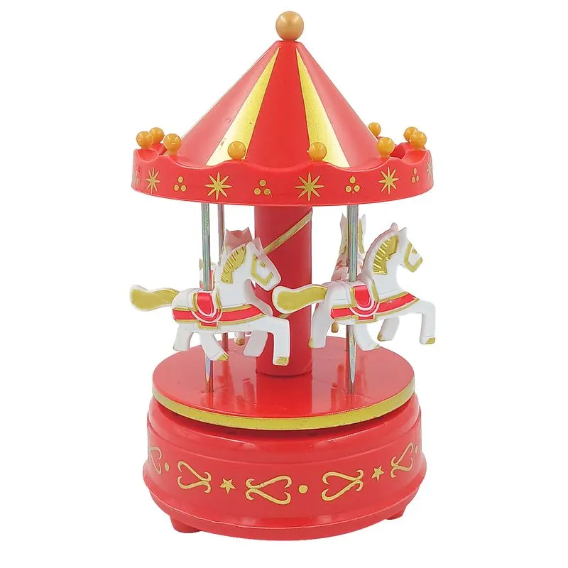 O Carrossel não precisa de pilhas, para ligar basta dar corda para ele começar a girar e tocar a música.