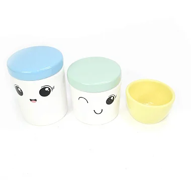 Fabricado em cerâmica o Kit Higiêne é ideal no auxílio as trocas de fralda e higiêne de seu bebê, com bonito acabamento para decorar o quarto da criança trazendo um toque mais que especial. Esse kit de 3 peças nós sugerimos para que seja usado como porta algodão, porta cotonetes e molhadeira.