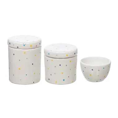 Fabricado em cerâmica o Kit Higiene é ideal no auxílio as trocas de fralda e higiene de seu bebê, com bonito acabamento para decorar o quarto da criança trazendo um toque mais que especial. Esse kit de 3 peças nós sugerimos para que seja usado como porta algodão, porta cotonetes e molhadeira.