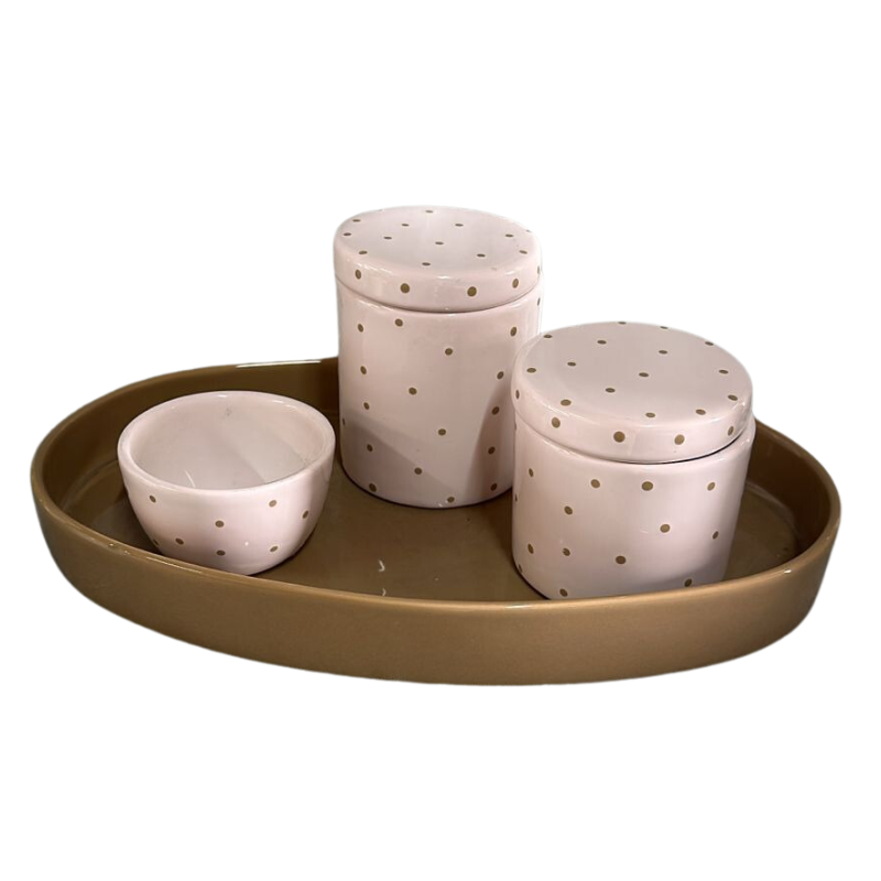 Fabricado em cerâmica o Kit Higiêne é ideal no auxílio as trocas de fralda e higiêne de seu bebê, com bonito acabamento para decorar o quarto da criança trazendo um toque mais que especial. Esse kit de 4 peças nós sugerimos para que seja usado como porta algodão, porta cotonetes e molhadeira.