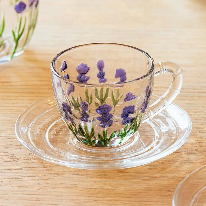 Xícara com pires para cafézinho em vidro, um amor de xícara super romântica com estampa de lavanda, um verdadeiro charme